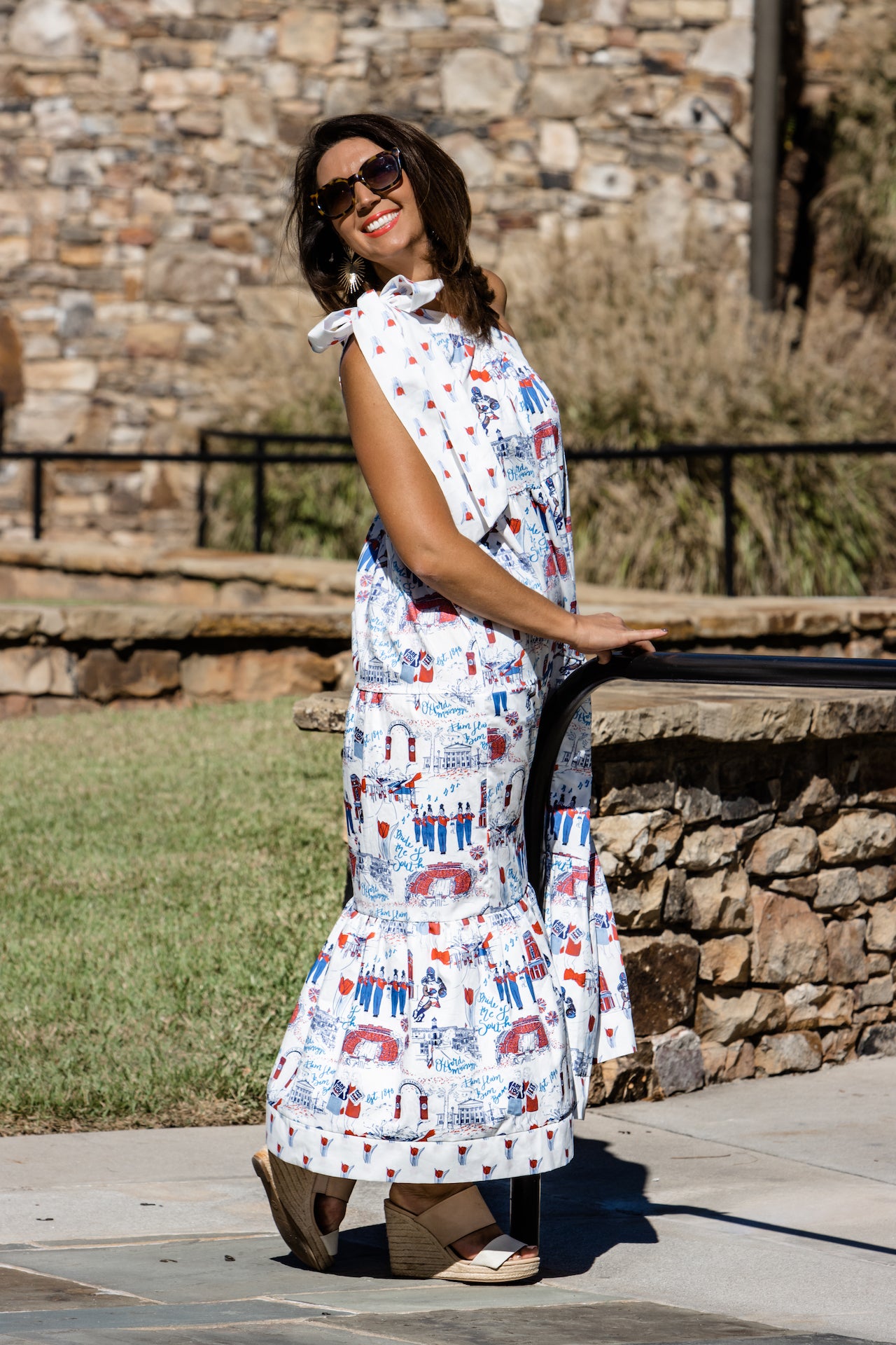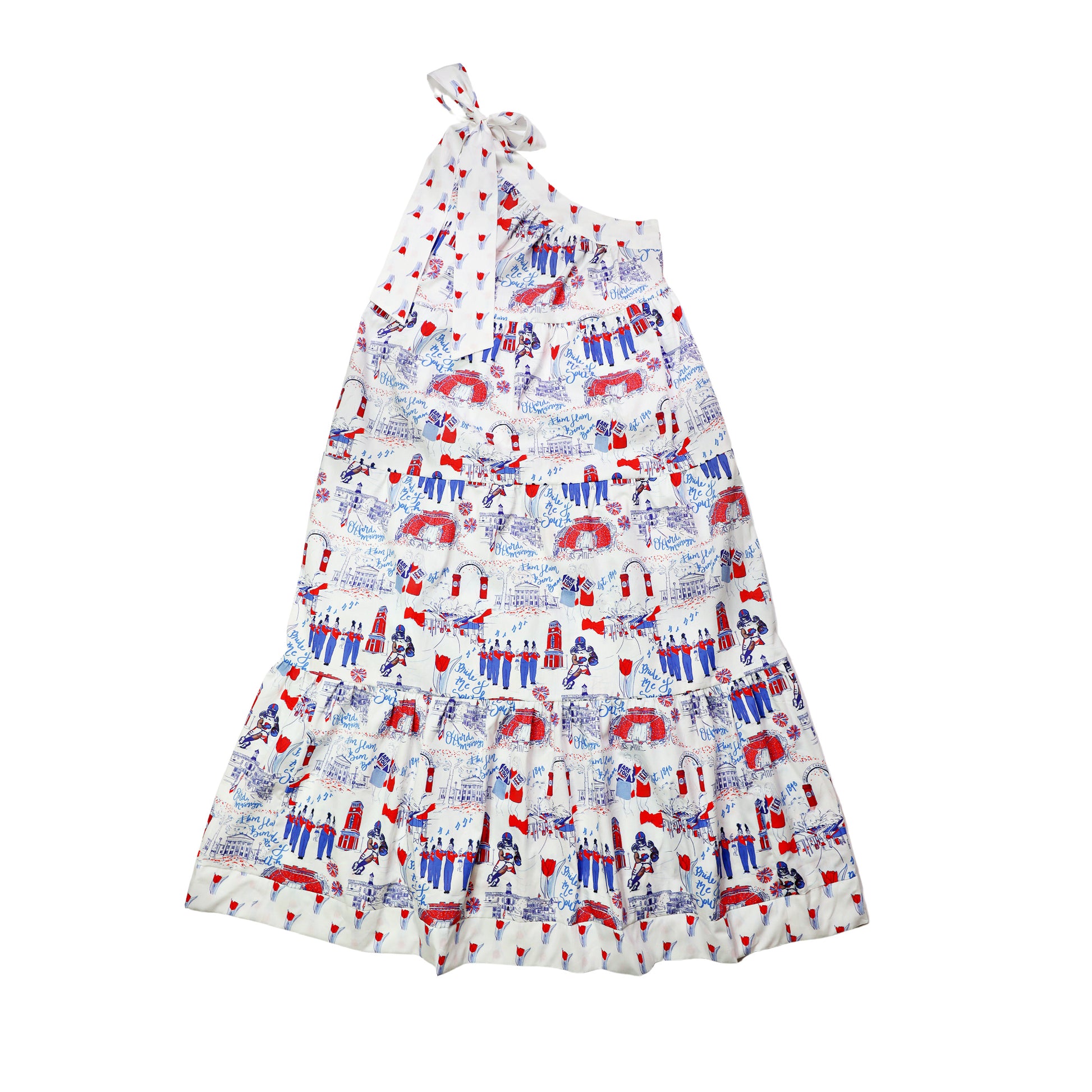 This custom toile maxi dress is a stunning piece embedded with the rich history of the Ole Miss. This dress is a staple addition to any closet and offers versatility for everything from Ole Miss game days to an evening out on the town. This classic maxi dress features a fun bow at the shoulder and banded trim at the hem with coordinating tulip print fabric. The Blair Dress also includes something that every woman loves: pockets. We hope you adore this dress as much as we do!